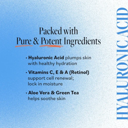 - Intense Hydration: Hyaluronic acid, known as nature’s “moisture magnet,” delivers deep moisture, rehydrating dry skin overnight.