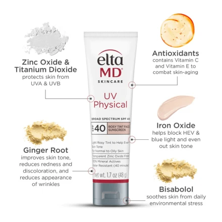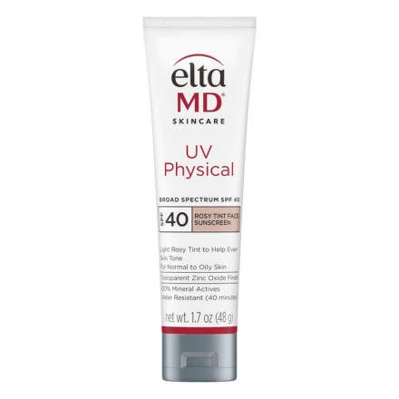 Protect and perfect your skin with EltaMD UV Physical Broad-Spectrum SPF 40 – Rosy Tint, a 100% mineral sunscreen designed for sensitive, oily, and normal skin types. Infused with a soft rosy tint, this lightweight formula blends seamlessly, helping to even skin tone and blur imperfections for a smooth, radiant complexion.