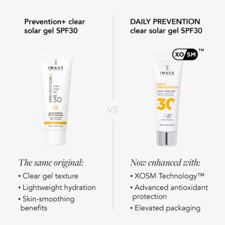 Experience next-gen sun protection with DAILY PREVENTIONâ„¢ Clear Solar Gel SPF 30, a completely transparent, waterless sunscreen powered by Image Skincare’s proprietary XOSMâ„¢ Technology. This smart encapsulation delivery system helps antioxidants like vitamin C, vitamin E, and green tea reach deeper into the skin for enhanced defense against oxidative stress and premature aging.