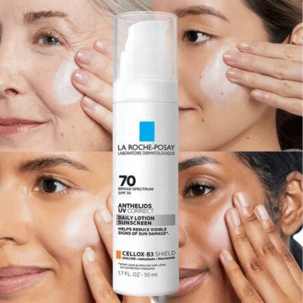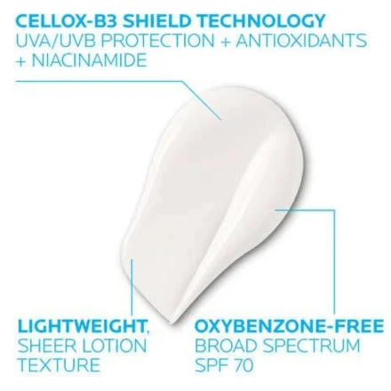 Discover La Roche-Posay Anthelios UV Correct, a daily anti-aging sunscreen for the face boasting SPF 70, clinically proven to seamlessly blend into all skin tones. This innovative formula not only protects against visible sun damage but also helps correct it, housed in a lightweight, non-greasy texture. Free of oxybenzone and octinoxate, it features Cellox-B3 Shield® technology, offering broad-spectrum UVA/UVB protection along with antioxidants and niacinamide (vitamin B3). This sheer finish lotion sunscreen visibly corrects uneven skin tone, fine lines, and rough texture, promoting a more even, smoother, and healthier complexion.