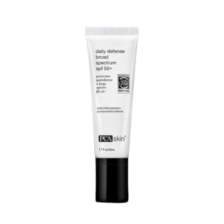PCA Skin’s Daily Defense Broad Spectrum SPF 50+ offers broad-spectrum protection for your skin during sun exposure. Zinc oxide helps absorb UV rays, while Ectoin® fights against environmental pollutants that contribute to aging and cell damage. The moisturizing SPF formula also creates a smooth and refined finish on the skin.